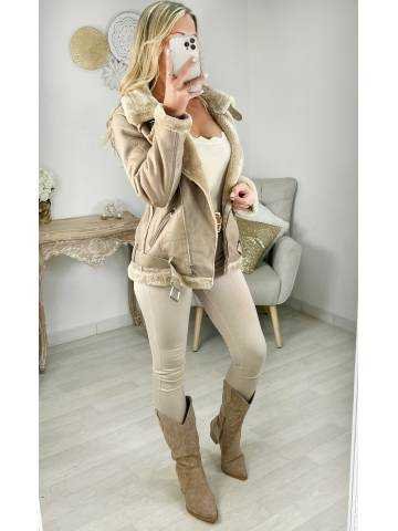 ☆ bombardier style cuir beige, intérieur entièrement fourré, zip et ceinture , il se porte droit.